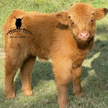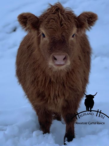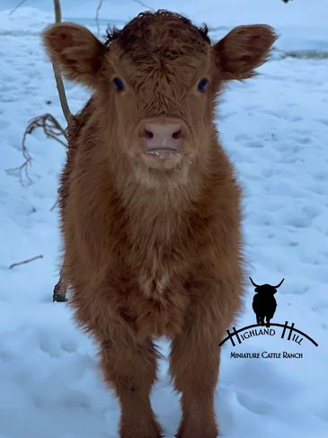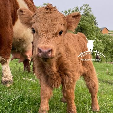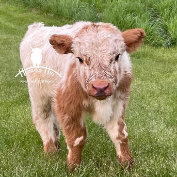 This heifer is tiny And so curious and sweet. Measuring 21' at birth. She is chondro positive. She will stay small and very feminine. Her dam is a red and white Panda. Sired by Chasin, our white highland bull.