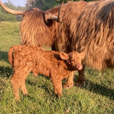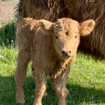 Another yellow! This little guy has a yellow dam and is sired by Chasin, our white highland bull. His brother from last year had the longest locks of hair and was super special. Hopefully this guy follows suit!