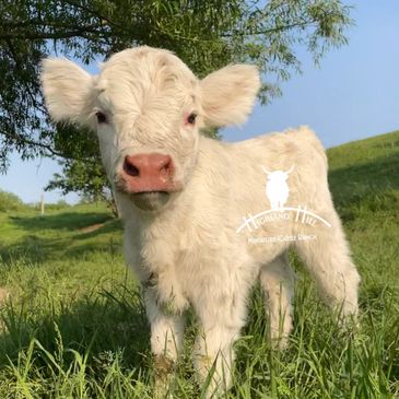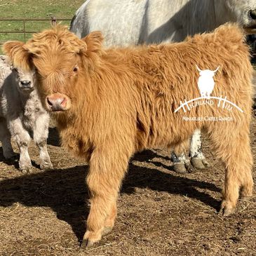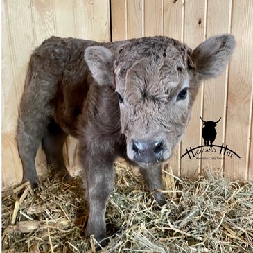 Look at the color on this guy! Such a unique two toned white little guy. Dam is a small frame silver highland and sire is a dun bull named Big Ridge Fergus from Elm Hollow Farms in TN. He possesses the very correct Scottish standards and passes on his very sweet temperament. He is a full-blood highland, but unregistered.