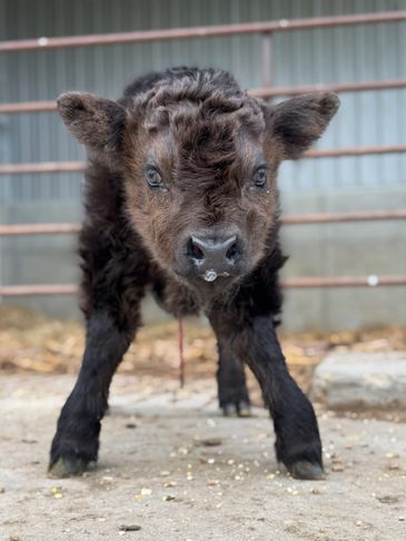 This little guy is as cute as they come! He looks like a tiny little black bear! Nice little compact structure, black as can be and likely chondro positive. Add him to your herd and get a bunch of little teddy bears in the future, or he would make a great short stout little pet. Your choice! Sired by our Highpark bull Brock and black highland cow Blanch. He is ~85% highland. Chondro Positive