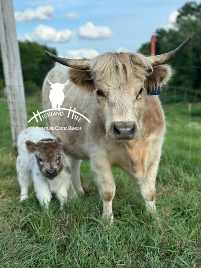 Luna is the most beautifully marked little silver tipped highpark heifer! She has the chrome in the right places we just had to retain her to keep the genetics on the farm. She is 39” at 2 years old. Her dam is Fionna, a 40" silver highland and sire is a 44" Highpark, Nash.